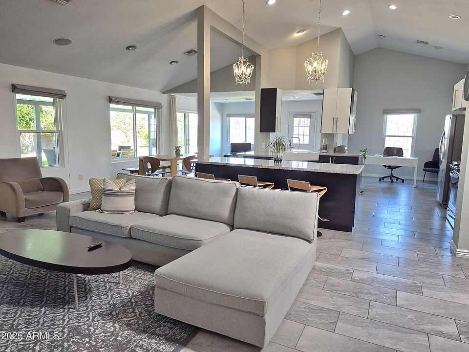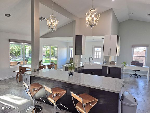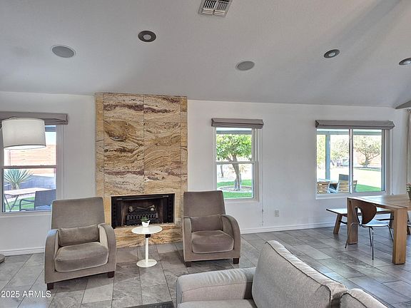 The Main Room has a huge Kitchen, Dining and Office areas and a Livingroom. It is entirely open and measures about 850 sq.ft. A stunning floor to ceiling decorative Natural Stone Fireplace is the focal point of this room. We had the chimney cleaned and closed and we had never used the fireplace. There is an electric fireplace insert that goes with the house. The Main Room gets nice natural light from a skylight and from 6 windows that are all around including a sliding patio door so that from every angle you can see the backyard. The ceiling is about 15' high at its peak which contributes to the very open, clean, lavish and inviting space. Look out to the lush and grassy backyard, inmidst of which you have an old and beautiful Lemon Tree. The entire backyard and front yard were professionally designed 8 years ago. The result is nice privacy due to the mature trees and plants, including 2 Orange Trees. The backyard is fully irrigated. The front yard is water wise/drought resistant and all plants are desert plants and there is no irrigation in front.