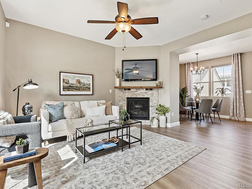 Experience the “wow” factor in this stunning townhome, ideally situated in the highly sought-after Ridgegate neighborhood of Lone Tree. Perfectly positioned just steps from two beautiful parks and hundreds of acres of scenic hiking trails, this home offers an exceptional lifestyle of convenience and connection. You’ll step inside to a warm and welcoming open-concept living space featuring elegant LVT flooring, 9-foot ceilings, and a cozy gas fireplace—perfect for chilly Colorado evenings. Large windows fill the room with natural light, creating a bright, inviting atmosphere. The stylish kitchen is a true highlight, offering white quartz countertops, stainless steel appliances, and abundant cabinetry. Just off the kitchen, the dining area includes a built-in refreshment station and opens to a spacious private patio—ideal for year-round outdoor living. Upstairs, you’ll find two generous bedrooms, each with walk-in closets and private ensuite baths. The conveniently located upstairs laundry area includes a washer and dryer, with an additional laundry hookup and custom cabinetry in the basement for extra flexibility. The finished basement adds even more versatility—it can serve as a third bedroom with its own bath and storage, or as the perfect space for a home gym, media room, or guest suite. Additionally, you’ll be within walking distance of everything—arts and recreation centers, shopping, the HCA medical facility, and the state-of-the-art Lone Tree Library. The neighborhood also boasts some of the area’s finest dining options. For added ease, residents can enjoy The Link, a free local shuttle service that provides effortless access to all the benefits of Lone Tree, including the award-winning Lone Tree Golf Club. With over 1,800 square feet of thoughtfully designed, low-maintenance living space in an unbeatable location, this move-in-ready townhome is your opportunity to work, live, and play in the heart of Lone Tree.