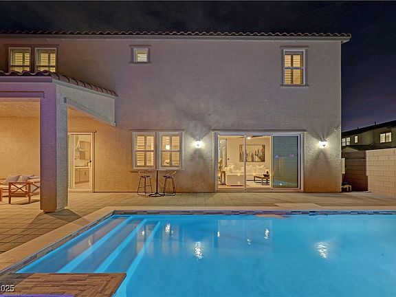 Gorgeous two-story Toll Brothers home in the desirable Skye Canyon community, offering modern luxury and thoughtful upgrades throughout. The stunning kitchen features upgraded cabinets, quartz countertops, a designer backsplash, stainless steel appliances, pot filler, and a spacious butler’s pantry complete with a sink and beverage refrigerator. Wood-like vinyl plank flooring enhances the entire home, adding warmth and style. This impressive 5-bed, 5-bath layout includes a downstairs media room, an open loft upstairs, and beautiful wood panel accent walls that elevate the home’s design. The large backyard is perfect for entertaining with its sparkling pool, relaxing spa, and covered patio offering plenty of room for gatherings. Solar will be fully paid off at the successful close of escrow, providing long-term savings for the new owner. Furniture is also negotiable, making this an exceptional move-in-ready opportunity in one of the area’s most sought-after neighborhoods.
