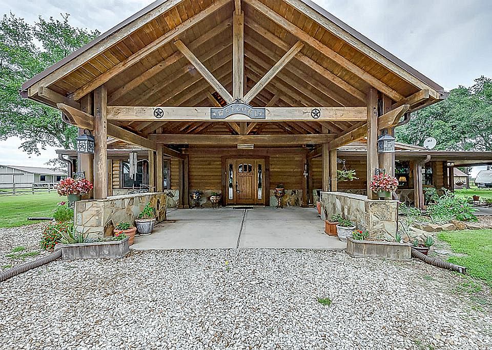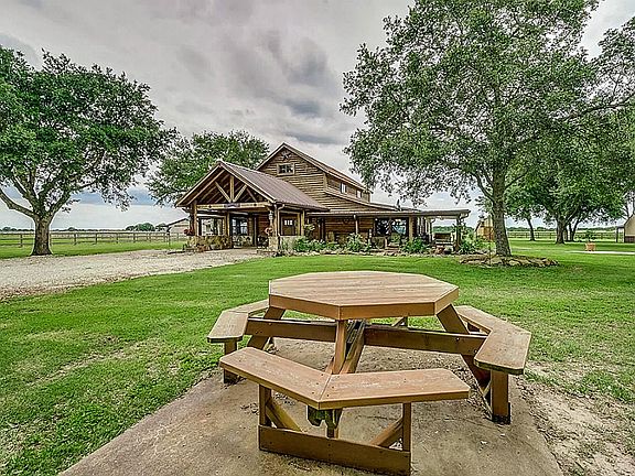 Chalet-style custom home resembles a Ski Lodge in the Rocky Mountains is one of a kind in Needville! Hand scraped hickory floors, bronze fixtures, knotty Alder doors, Granite counters in kitchen w/Copper Farm style sink & under cabinet lights, double paned windows, Generac backup generator, & MORE!! Master suite is enormous & has expansive windows w/views, 36x25 shop w/cabinets/counters, 36X36 Barn Master barn w/2 stalls, tack room, hay storage, 12x10 storage shed, stocked pond, & WOODED!