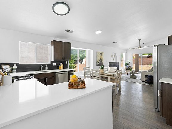 This property has been fully renovated with high ceilings and abundant natural light that create a bright and open living space, complemented by a cozy gas fireplace for those chilly evenings. The exterior features new stucco and a new roof, while the interior boasts new flooring throughout--no carpet, only elegant laminate and tile for easy maintenance. The kitchen is a chef's delight with stainless steel appliances and sleek quartz countertops. Bathrooms have been tastefully renovated with contemporary finishes and fixtures. Upgrades include new refrigerated air and furnace, as well as a new water heater. A convenient sliding glass door leads to the outdoor patio, perfect for entertaining or relaxing. The large backyard includes a shed and backyard access!