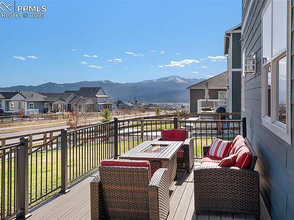 Located in Bradley Ranch on a corner lot with unobstructed views of Pikes Peak, this spacious 5-bedroom, 3-bathroom former model home offers a versatile layout and desirable features throughout. Situated in the award-winning D20 school district, it’s ideal for both everyday living and entertaining. The main level includes a bedroom with a full bath, a dedicated office or dining room, and an open-concept kitchen with an oversized walk-in pantry, which flows into the living and dining areas. A large newly built deck offers the perfect spot to take in mountain views, while a hot tub tucked privately on the side of the home adds a relaxing retreat. Upstairs, you'll find a loft, a spacious primary suite, and 3 additional bedrooms. The unfinished basement provides room to expand, and the oversized 3-car garage gives you plenty of space for storage, hobbies, or vehicles. This home combines functionality, space, and stunning views in one of Colorado Springs’ most sought-after neighborhoods. Don’t miss your chance—schedule your showing today!
