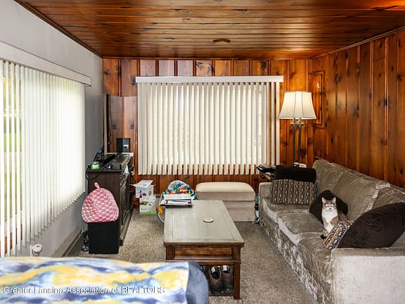 Appreciate the large lot on this Waverly schools homes with great location to commute to greater Lansing. This home is an ideal fit for a contractor, flipper or DIYer. Walk up to the front porch and appreciate the fresh mulch, covered patio to front entry and attached 1 car garage. Walk inside the fresh carpet greets you in living room and leads to hallway wing. Hallway wing has bath with some nice updates, and 2 bedrooms. Lots of knotty pine wallboards throughout. Kitchen is off living room with new black stainless appliance package (and new counters and sink in garage to remain). Dining area off kitchen with back entry to rear patio. Large mud room used to house laundry and half bath and could be made back into those functions. Electric baseboard heat throughout. Shed.