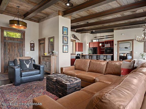 One of Jackson's most unique residence located above the valley floor with stunning views overlooking the valley floor, Snow King and the Wyoming range. Offering a total of 5 bedrooms, 4 and one-half baths across 4,864 square feet of thoughtfully designed living space with southern exposure offering exceptional year round sun and warmth. This home combines flexibility, with very little maintenance and all town services only minutes away. The outdoor spaces offer multiple decks and seating areas. A storage barn, ample overflow parking, oversized heated garage and an RV hookup compliment the Jackson lifestyle. Steel and cement architectural elements, combined with reclaimed timbers and barnwood add a rustic charm and warmth to the modern design. A prime location just minutes from the Square Three kitchens and living spaces offer privacy, while shared outdoor areas invite gathering, relaxing and stunning views over West Jackson and beyond. Radiant in-floor heat, custom cabinets, custom doors, custom railings, and reclaimed timbers and finishes throughout.