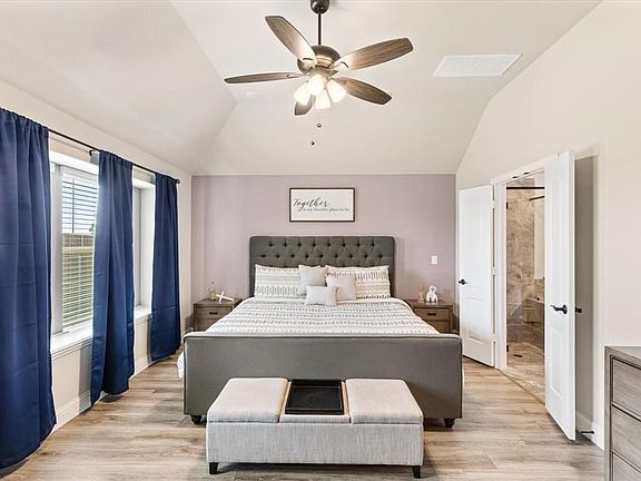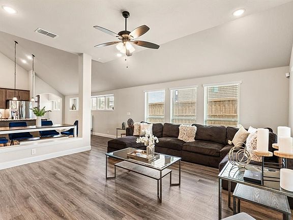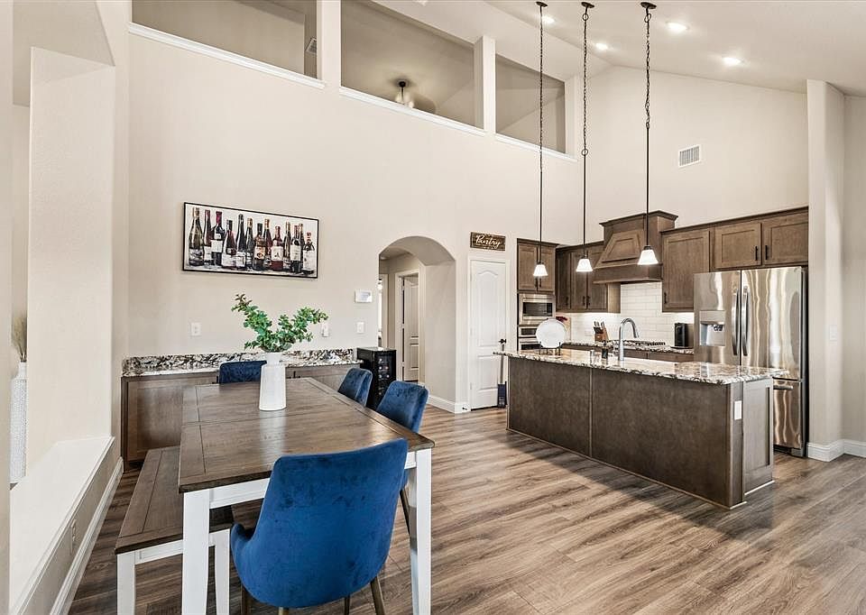 The spacious entry way features a modern wood and glass 5 panel door and is the perfect introduction to the home. To the right of the entry is your office easily accessed through beautiful French doors and full of natural light. The Kitchen is the star of the open concept living area with upgraded appliances, cabinetry, and oversized island with a large under-mount sink, pendant lighting, and built in buffet in the dining area. You'll note luxury vinyl flooring and recessed lighting throughout the main living area. Your large Owner suite has an upgraded ensuite bath and huge walk-in closet. Three sleeping rooms are on the lower level with a split floor plan. The fourth bedroom, game room, a full bath and work area are upstairs. An extended covered patio with decorative lighting compliments this Texas sized yard on a coveted corner lot. Devonshire has two clubhouses and community pools (third pool slated for 2024 completion), basketball court, volleyball, dog park, ponds and trails. 2023-10-18