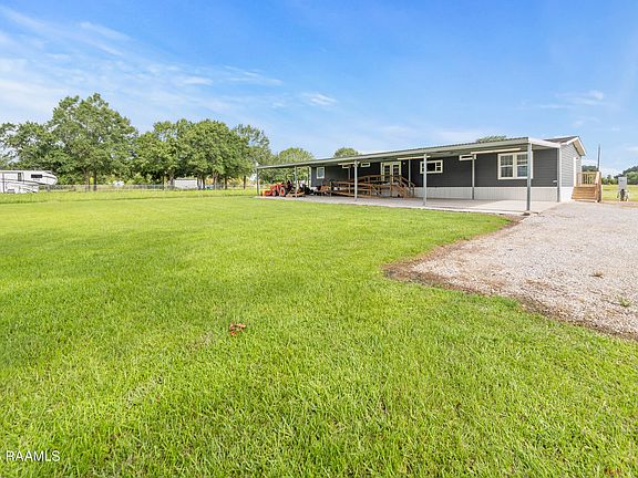 Nestled on the outskirts of Duson and Scott, inside Lafayette Parish, this meticulously maintained home offers the perfect blend of peaceful country living with convenient access to town. Set in a tranquil, serene setting on over 7 acres of open and wooded land, it's a private retreat designed for both comfort and practicality.The home sits on a solid 8' slab foundation with tie-downs anchored into the concrete and a footing already set under skirting for brick surround, and skirting rails secured to both the slab and floor joists--offering exceptional structural integrity. A new roof was installed in May 2025 and comes with a transferable warranty for added peace of mind.Inside, you'll find spacious bedrooms, a generous kitchen and living area ideal for gathering, and an oversized pantry--large enough to double as an office or workspace. A beautiful stone tile wall surrounds the fireplace, creating a warm focal point in the main living area. A handicap-access ramp makes entry easy for everyone.Outside, there's room for all your vehicles and toys with 5-car covered parking and additional open parking space. Whether you're looking for a quiet place to unwind or a solid, move-in-ready property close to town, this home truly checks all the boxes.