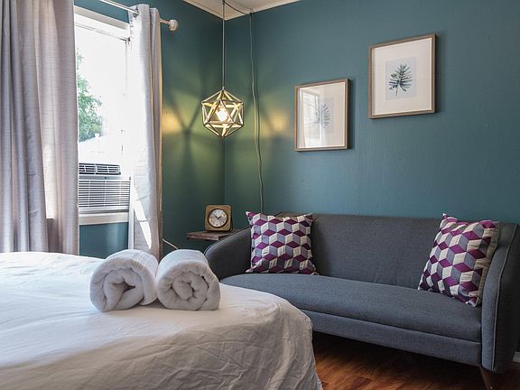 This charming studio can accommodate up to 2 people, and is located toward the rear of a beautiful, historic Victorian triplex, with its own private entrance. There is a washer and dryer on-site for your use, and air conditioning in the unit. Relax and watch your Netflix or Hulu on the 55" Smart TV, and sleep comfortably on a queen size memory foam mattress. The kitchenette has a microwave, Keurig coffee maker, sink and mini fridge. Please note, there is no stove or oven. There is a small dining table that can double as a work station. You are within walking distance to cafes and restaurants. Flexible terms 6 month - 1 year leases, Fully Furnished Utilities are $100/month/person and include electricity, gas, water and trash