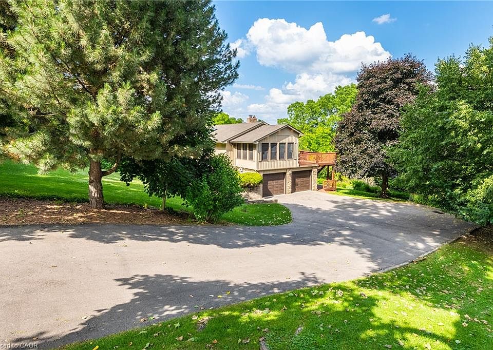 LOCATION...LOCATION...LOCATION This lovely home is situated on 1.2 acres of gorgeous land, backing onto greenspace, which has direct access to the Grand River. Immerse yourself in the tranquil beauty of nature while just moments from shops, restaurants & schools. Outdoor enthusiasts will love the forested trails and access along the river, ideal for fishing & kayaking . This lovely home has a great unique layout and design with spacious rooms and wall to wall windows capturing spectacular views of the property of lush greenery and the river (in the Winter). An amazing spring fed pond that has Koi fish. Its perfect for playing hockey and ice skating. The grounds are beautiful with mature trees and easy to maintain perennials. This raised bungalow is designed for adult living and entertaining with primary bedroom suite separate from the other bedrooms. The living room/great room features vaulted ceilings, hardwood floors and floor to ceiling stone fireplace. The large dining room also has vaulted ceilings and massive windows capturing the stunning views. The sunroom off the eat-in kitchens is a great space that the owner uses all year. The primary bedroom has a nice sized walk in closet, sliders to a small private deck and a newly renovated 5 piece ensuite, that features double sinks, soaker tub and walk-in shower. The lower level is a walk-out basement, so its nice and bright. It doesn't feel like you're in a basement. Sliders to a deck from the recreation room, which has a gas fireplace. There are 2 spacious bedroom (ideal for teenagers and or guests) both with large windows. Updated lower level 3 piece bathroom. The garage is an oversized 2 car garage with inside entry. Lots of parking too. Updates: roof shingles 2020, siding 2020, eaves troughs 2020, furnace and A/C 2020; water heater (2020), water softener (1 yr), all 3 bathrooms were renovated in 2020 and most windows have been replaced. Homes on this kind of land don't come around very often.