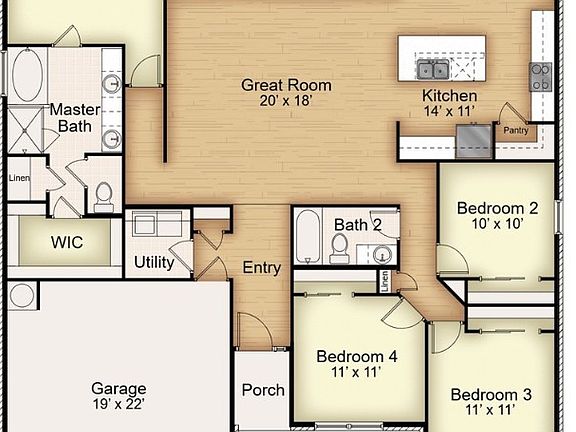 A popular choice among young families, the Houston floor plan offers a suitable living space with four bedrooms and two bathrooms. The kitchen includes stainless steel appliances and a large walk-in pantry, while the primary suite has dual vanity sinks, a private water closet, and a walk-in closet. Plan variations include a walk-in shower or a separate tub and shower in the primary bath and an outdoor fireplace.
