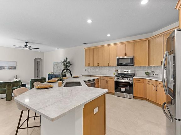 Welcome to this stunning, fully remodeled 4-bedroom, 3-bath, 3-car garage pool home in the highly sought-after Fords neighborhood of Westchase! Step inside and be greeted by soaring vaulted ceilings and a bright, open living and dining area with elegant double doors leading out to the pool. Every detail has been thoughtfully updated, featuring brand-new flooring throughout—sleek 32x32 porcelain tile in the main living areas and rich coffee-toned luxury vinyl plank in each bedroom. At the heart of the home lies a showstopping chef’s kitchen, beautifully designed with Taj Mahal quartz countertops, warm wood custom cabinetry with soft-close drawers, a gas cooktop, stainless steel appliances, and a smart refrigerator. The adjoining family room is filled with natural light and opens through another set of French doors to your private outdoor oasis. Outside, enjoy your screened-in pool retreat, fully transformed with brand-new pavers, drain lines, resurfaced pool, and a brand new pool pump—perfect for relaxing or entertaining year-round. The spacious primary suite offers a peaceful escape with pool views and room for a private sitting area or home office. The luxurious en-suite bath includes dual vanities, a soaking tub, walk-in shower, and an expansive walk-in closet. Two additional bedrooms share a beautifully updated bathroom, while the fourth bedroom - with access to the pool - would make a perfect guest suite or in-law space. Additional features include an indoor laundry room with washer and dryer, a 3-car garage with Tesla charger, and recently updated HVAC system, Water Heater, and Roof. Located in Westchase—ranked Niche’s #1 Florida suburb to live in (2023)—you’ll enjoy resort-style amenities including two community pools, tennis and pickleball courts, playgrounds, and access to a top-rated school district. This beautifully reimagined home truly has it all—modern luxury, thoughtful design, and an unbeatable location.