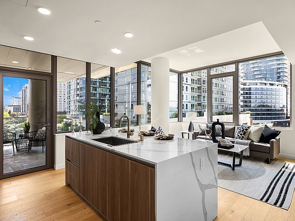 Private balconyCorner unitModern kitchenNatural lightWood-paneled appliancesQuartz countertopsOpen-concept living space