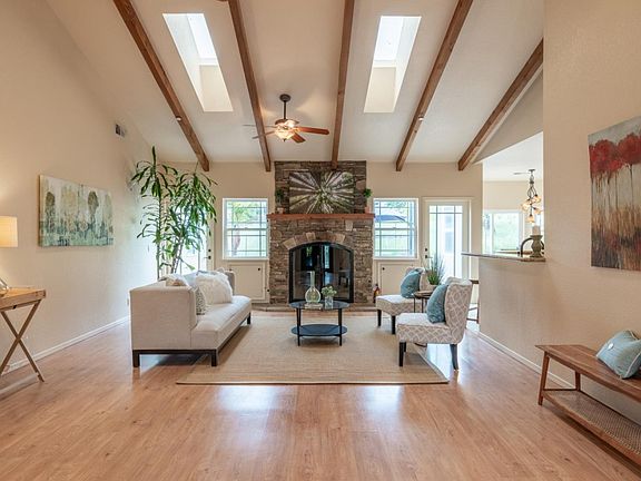 Inside, the home boasts two gas-starting, wood-burning fireplaces, granite countertops, laminate and tile flooring, and vaulted ceilings w/ exposed wood beams. The open floor plan includes an eat-in kitchen, breakfast bar, and formal dining room, creating a welcoming space for family and friends.