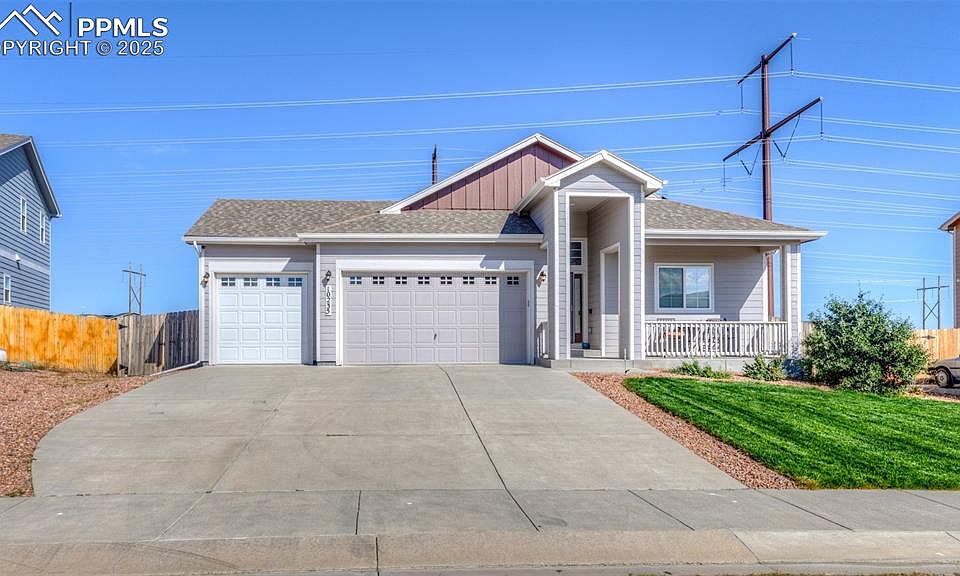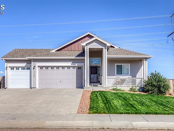 Welcome to a beautifully maintained 3-bedroom, 2-bath ranch home built in 2019. With 1,590 finished sq ft on a generous 10,255 sq ft lot, this property combines modern comfort with Colorado’s wide-open charm. The inviting front porch leads into an airy open-concept layout filled with natural light. Inside, a large living room flows seamlessly into a dedicated dining area and an impressive kitchen. The kitchen showcases solid-surface countertops, an expansive eat-in island, and stainless appliances—including range, microwave, dishwasher, and disposal—making meal prep and entertaining a breeze. Luxury vinyl flooring and plush carpet provide warmth and style throughout. The private primary suite is a retreat of its own, featuring a spacious walk-in closet and a luxurious 5-piece bath with soaking tub and separate shower. Two additional bedrooms and a full bath sit on the opposite side of the home, offering ideal separation for family or guests. A convenient laundry room and easy garage access complete the thoughtful single-level design. Outdoors, enjoy a huge, level backyard that backs to open space for privacy and scenic views. A separate side gate provides easy access for RV or boat parking, perfect for storing recreational vehicles or extra toys. Automatic sprinklers and full fencing keep maintenance easy, while the oversized 3-car garage—with 220-volt service and plenty of storage—offers room for vehicles, a workshop, or gear. Additional highlights include forced-air natural gas heat, central air conditioning, vinyl windows, concrete driveway, and low-maintenance masonry and wood siding. Located in desirable District 49, close to parks, schools, shopping, and hiking trails with quick access to Woodmen Road, Meridian, and major military bases, this home delivers comfort, space, and Colorado lifestyle in one beautiful package.