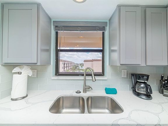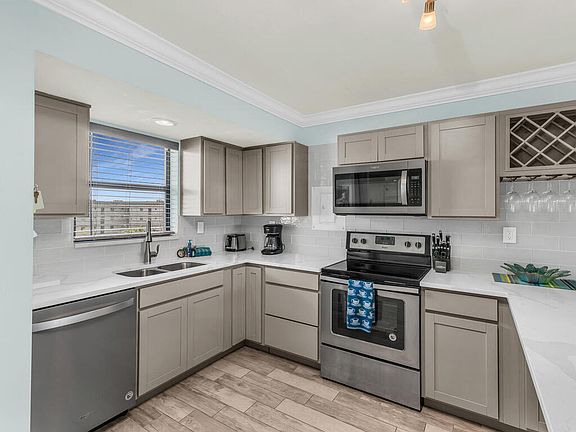 New furniture with 2 couches that are pull out beds and are perfect for hosting guests in the light and bright coastal design. Stunning tile floors and walk in shower with therapeutic pebble shower floor for a luxury feel and a new vanity. New carpet in the bedroom and new king size bed, custom closet shelving plus a locked owners closet for personal items. Anglers Cove is a waterfront resort style community with boat docks available for leasing and is direct Gulf access. Along with 2 huge pools 2 hot tubs, 2 tennis courts and an outstanding outdoor restaurant for all to enjoy.