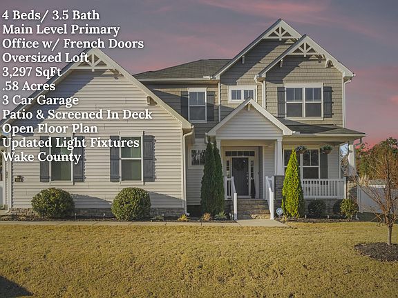 FRESH PRICE!!! Welcome to Jarrett Bay Road, where space, style, and everyday comfort come together on a peaceful nearly .6-acre lot in Wake County. This thoughtfully designed 4-bedroom home with a private office, 3.5 baths, and an oversized loft offers the flexibility today's buyers are looking for. The main-level primary suite provides easy living and features a spacious walk-in closet. Throughout the home, you'll appreciate updated light fixtures, freshly steamed carpets, painted shutters, and refreshed landscaping that give the home a clean, move-in-ready feel with standout curb appeal. Start your mornings on the covered front porch, and end your days enjoying the screened-in deck and open grilling patio; perfect for entertaining or relaxing. The fully vinyl-fenced backyard offers plenty of room for play, pets, and gatherings, while the three-car garage easily accommodates vehicles, a golf cart, hobbies, and extra storage. Conveniently located 5 minutes from Beech Bluff County Park, 15 minutes to Costco, Harris Teeter, and Starbucks, and soon just 10 minutes from the new Target shopping center, this home offers both tranquility and accessibility. Zoned for desirable Wake County schools, it's the perfect blend of suburban calm and everyday convenience. With refreshed details, generous space, and an unbeatable location, this home truly checks all the boxes. $3,000 lender credit available with Jason Harris at Advantage Lending!