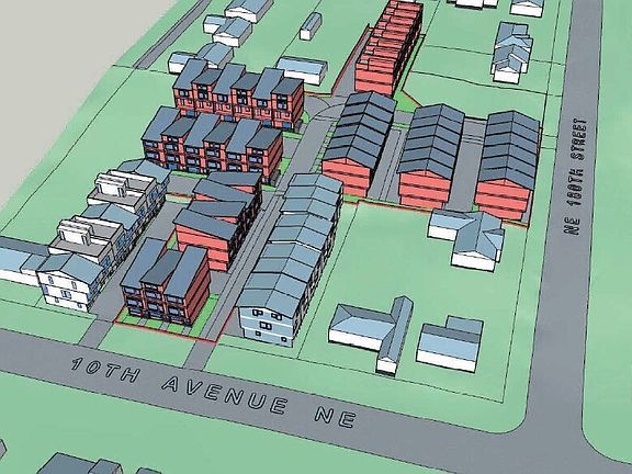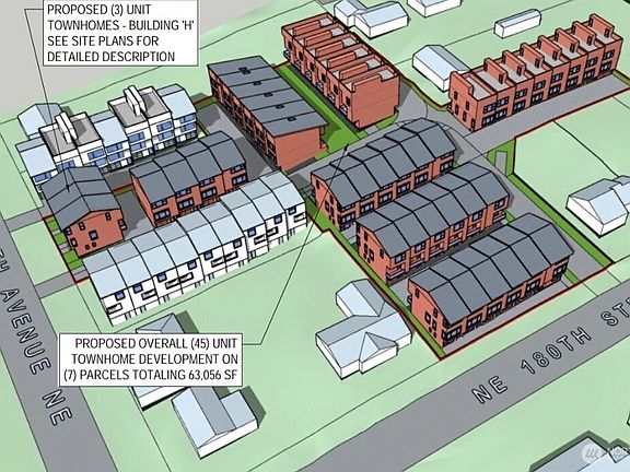 Northcrest Townhomes 45-Unit Community. Presenting a unique chance to acquire a seven-parcel assemblage zoned MUR-35, totaling 65,179 SF in a prime North Seattle location and less than one mile from the light rail. This site is near permit-ready, with complete architectural and civil plans as well as design package - significantly reducing entitlement work and time to construction. The thoughtfully designed community calls for 45 modern townhomes, offering a mix of 2- and 3-bedroom layouts, each with a private garage. Floor plans range from 1,310 to 1,615 sq.ft., appealing to a wide buyer and renter demographic in one of the region’s fastest-growing transit-oriented corridors. (Price includes permits).