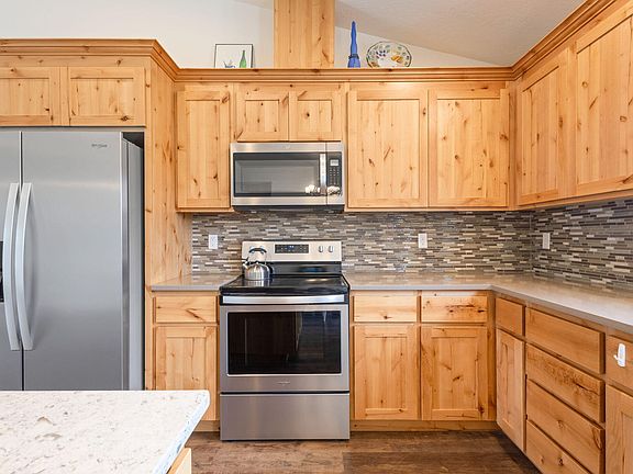 Beautifully maintained single-level home tucked away on a peaceful cul-de-sac in Northeast Prineville. Nearly new, this home features stylish laminate flooring throughout and vaulted ceilings. The open-concept great room design offers excellent flow and privacy with two generously sized bedrooms and a full bathroom on one side, and a private primary suite on the other. The kitchen is a chef's dream, showcasing stunning quartz countertops, knotty pine cabinetry, a spacious island with a breakfast bar, and stainless steel appliances. Additional features include a two-car garage, gated RV parking, and a fully fenced backyard with a cozy patio space. Just around the corner from Ochoco Creek Park which offers, a skate park, pickleball courts, a playground and more.