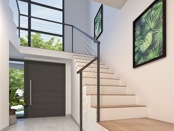 The first floor presents an open living and dining area flowing into a contemporary kitchen with a central island. Full-height sliding glass doors connect the interior to a covered terrace and private backyard, creating a seamless transition to the outdoors. As a corner residence, the home benefits from additional windows and wider water views along the Rubicon Canal.
