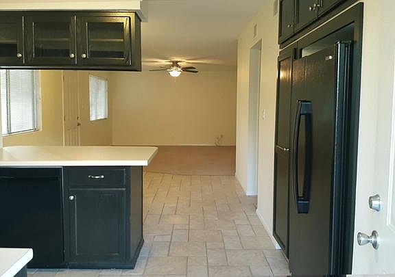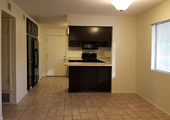 This single level, 2 bedroom has an open floor-plan with a huge great room (kitchen, dining area & living room), & neutral colored ceramic stone tile in the kitchen, dining area, hallway & bath. The kitchen has been updated with espresso cabinets and all black appliances (refrigerator, range, dishwasher and microwave). Both bedrooms are very large, carpeted & have ceiling fans. There is plenty of storage, with 2 hall closets, 2 separate linen closets, and there is also an outside storage shed. Covered, lighted parking, and there is a small fenced yard with a nice flagstone patio just outside the kitchen door. Conveniently located near ASU, Tempe Town Lake, the 202, Mill Ave, the Light Rail, and the Free Orbit Shuttle and bus stops are only a few steps from your front door! The pet policy allows up to 2 cats (subject to some restrictions and additional charges) but does not allow dogs (sorry). It will be available to lease by March 7th, perhaps sooner, and can be shown by appointment as early as February 28th. Rent is only $1075/mo and includes water, sewer and trash!