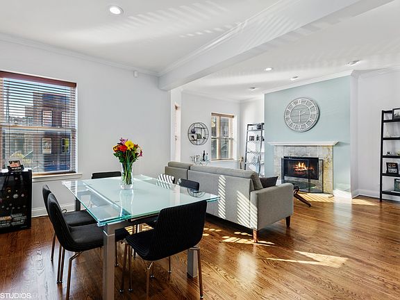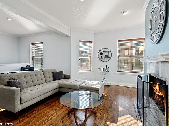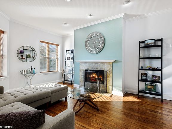 Vintage charm meets modern luxury! Formal living room with fireplace and dining area on the main level leads way to a large eat-in kitchen with updated cabinetry, quartz counter tops, center island, pantry and stainless-steel appliances. Large, private deck is perfect for grilling and outdoor entertaining. Enclosed, shared backyard with turf and communal garden offers extra outdoor space. Main level also features a powder room and bedroom with en suite bath. Spacious, lower level family room is filled with natural light. Primary bedroom features a second en suite bath with dual sinks, whirlpool tub and walk in shower along with two custom organized closets. Ample storage throughout and side by side laundry. Two parking spaces, one garage and one exterior included. Low assessments and well-maintained building. Steps from Sheridan Red line, lake path, golf course, Wrigley Field, grocers and dining.