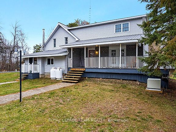 Welcome to your country retreat-an inviting 4-bedroom home set on 3.7 acres of peaceful rural landscape. This transformed farmhouse blends timeless character with modern comfort, thanks to a spacious addition that offers room for the whole family.A wraparound covered porch greets you with classic farmhouse charm. Step inside to a welcoming foyer with a large closet, opening into a bright living room featuring a stone woodburning fireplace and terrace-door access to multiple outdoor living spaces. Just a few steps away, the eat-in kitchen offers warm wood cabinetry, a cozy woodstove, and access to a lovely sunporch-an ideal spot for morning coffee, plants, or flexible living needs. A formal dining room provides the perfect setting for hosting gatherings. The renovated main-floor bath impresses with beautiful tilework, a separate shower, and a deep soaker tub.Upstairs, the generous primary suite is a true retreat, complete with in-floor heating, a 4-piece ensuite with soaker tub and separate shower, and a spacious walk-in closet. The bedroom itself is expansive and filled with natural light, offering tranquil views of the grounds. Three additional second-level bedrooms are all well-sized; one is currently used as a home office and includes its own 2-piece ensuite.Efficient geothermal heating with wood backup keeps the home comfortable year-round. Outside, a triple-bay driveshed, log workshop, and detached single-car garage offer excellent storage and workspace options. The wide-open area behind the home provides endless possibilities-gardens, play space, hobby projects, or simply room to breathe.A true country paradise-this remarkable property is not to be missed.