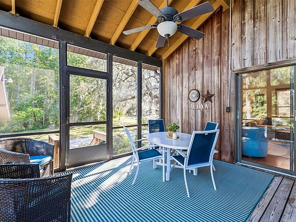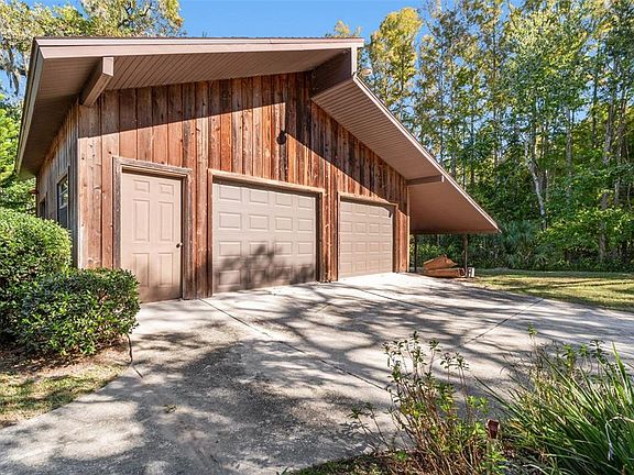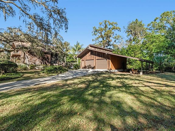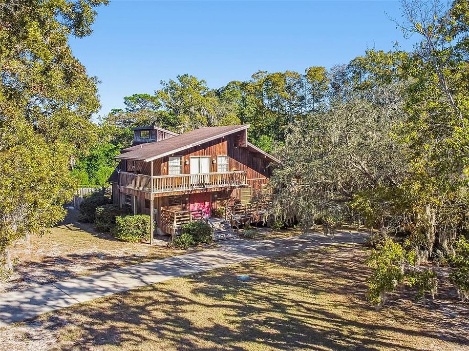 Discover a truly rare offering in Golden Acres! A beautifully crafted 3 bedroom, 2 bath pool home with a detached 2 car garage and a full Florida basement, situated on a private wooded corner lot with no neighbors beside you. This inviting residence features warm wood flooring, vaulted ceilings with exposed beams, abundant natural light, and custom hand built cabinetry throughout. The farmhouse style kitchen includes granite counters, a built in farm table, and a hidden butler’s pantry, while the main level also offers an updated full bath and spacious living and dining areas. The rare full basement provides year round cool temperatures, storage rooms, laundry, mechanicals, and flexible living space. Upstairs includes two generous bedrooms, an updated bath, and a large primary bedroom with a walk in closet and access to a private wraparound balcony overlooking the tranquil, wooded grounds. Outdoor living shines with multiple porches, an open deck, a fully fenced pool area with screened lanai, and ample parking for boats or equipment. The oversized detached garage offers vaulted ceilings and exceptional storage, completing this one-of-a-kind property. Homes with this character, craftsmanship, privacy, and land are rarely available especially under $500K—making this Golden Acres treasure a must see (ROOF-2010)(A/C-2019)