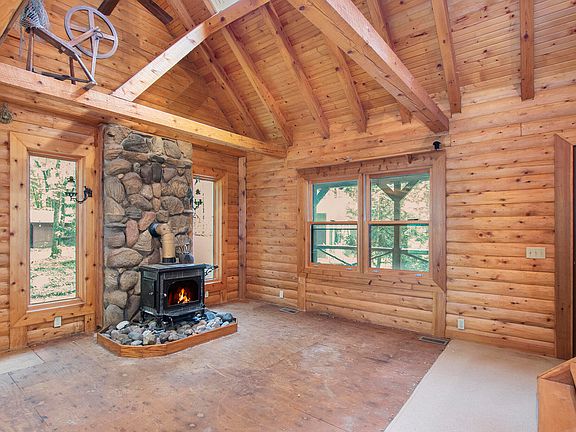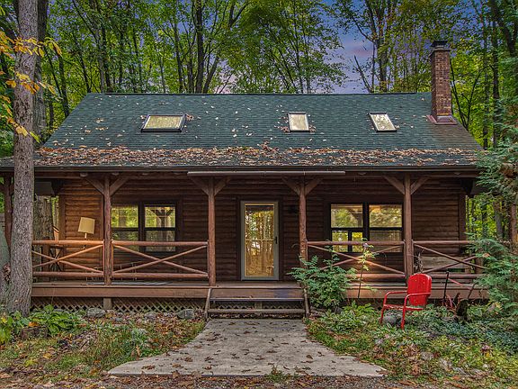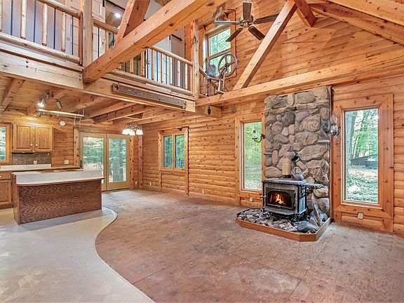 This homes new owner will enjoy the 10 peaceful, wooded acres with a beautiful log home nestled within. The homes primary suite is on the second floor as well as a second bedroom. From this level you can look down onto the open main floor and the beautiful wood beams. On the main floor there is another bedroom, laundry/mud room, full bath with a gorgeous walk-in shower and the kitchen/dining/living rooms. The living room has a wood stove with stone hearth that easily heats the home. The basement has daylight windows along the back wall that you can see out into the woods through. With this unfinished area, there are many options of completion. The wooded acreage holds trails, 2 smaller outbuildings, a pole barn and a carport by the side entry of the house. 600 sq ft in basement just needs flooring to make it totally finished.