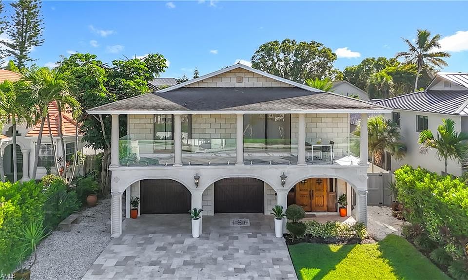 Take advantage of trully unique opportunity to purchase this two story artistically furnished home that perfectly blends modern sophistication with timeless design in the heart of Naples Park . Located on quiet Vanderbilt drive within walking distance to the beach and the dining at Ritz Carlton,La playa and Turtle club , this property has long water view of canal leading to Naples Bay. Elegance, comfort, and convenience: Sparkling chandeliers, intricate tile work, and expansive marble slabs, complemented by warm European oak flooring, create a radiant and refined interior.This unique home offers separate guest suite with full size kitchen/living sleeping area that can be also mother in law dwelling, as well as top 3 bedroom 2.5 bath eclectic residence that is connected with generously appointed staircase that is utilized as art exhibit space ! A private pool compliments beautiful outdoor space — a covered pool deck / lanai and an upper-level balcony — offers ideal unique space for enjoying iconic Naples sunrises on the pool area and sunsets from the upper level living room. The two kitchens feature top of the line appliances, custom made countertops, artistic accents, and a new marble backsplash . Thoughtful floor plan design allows for all rooms to have perfect privacy and views. Master bedrooms showcase sweeping views of canal leading to NaplesBay, where you can watch boats come and go throughout the day , adding movement, beauty, and a true sense of water view living. Step outside to your private retreat, complete with a pool and beautiful garden . Recent updates include a sleek glass railing around the front deck, and a striking imported Italian porcelain accent floors .Review the virtual tour link for a video of this home, it is truly stunning.