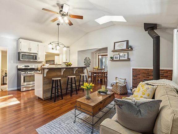 Inside, the open floor plan welcomes you with vaulted ceilings, creating a spacious & airy atmosphere perfect for both relaxation & entertaining.This remodeld home seamlessly blends original charm with modern amenities, featuring laminate flooring, tile & updated counters. The heart of the home is the kitchen, complete with stainless steel appliances, a cozy wood stove for those cool winter evenings, & breakfast nook perfect for enjoying casual meals.