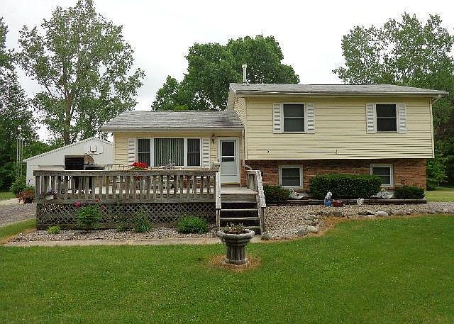 Quad Level home with many updates. Large spacious kitchen, dining/living room, Family room includes wood burner, with patio door leading to large back deck. Master bedroom with master bathroom, Jacuzzi tub and a large front wrap around deck for entertaining. Large pole barn and a brook to sit near and watch the fish swim by. Nice family neighborhood.