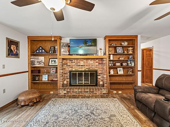 Brick Charm Meets Florida Living! Ranch style home with columns, large front porch, and a screened private POOL on a 0.40-acre corner lot. BRAND NEW 2024 ROOF. Address is on Horizon Drive, but the driveway access is on Carrin Road. Inside, a practical split plan offers 4 bedrooms / 3 baths / 2-car garage with no carpet! Tile and laminate throughout. The living room, in the center of the home, has a brick wood-burning FIREPLACE flanked by built-in bookshelves and French doors that open to the pool. Kitchen features Wood cabinetry, Corian Counters, black Refrigerator, black Dishwasher, black Double Ovens, and a stainless steel Microwave, with a breakfast nook plus a separate dining area. Wood trim details throughout. Baseboards, chair rail, and solid wood doors which add durability and warmth.
