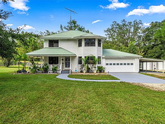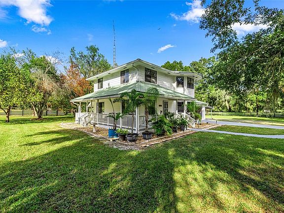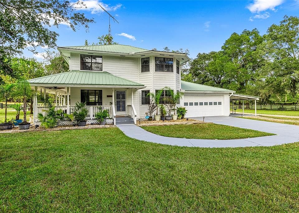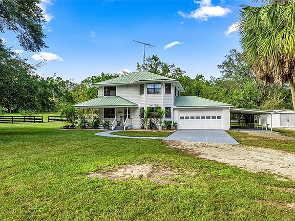 Rare opportunity to purchase a beautiful 10 acre horse lovers paradise in Southwest Ocala! Ideally located with the convenience of town and the serenity of the country. Sip your morning coffee while watching your horses graze as you sit on your wrap around porch. High and dry - Flood Zone X. No HOA and A1 zoning so feel free to bring your horses, cattle, goats, chickens, etc. 4 large paddocks with huge granddaddy oaks scattered among them for shade and beauty. Huge Mulberry tree and other fruit trees. 85% of the fence is new board with no climb. 3 stall barn with storage above and covered overhang. Gated entry with keypad and security lighting. 1 yr old $7000 36 by 12 run-in shelter. 3 new hay shelters plus one older one. Large garage building- 40ft by 25ft- is a mechanics dream with an overhead door and covered porch-40 ft x 19 ft- but could have many uses. New main well pump - 1 yr old. Large RV cover/awning next to the garage building. 3RV hookups -electric and water only- 2/50 and 1/30 amp. Detached Tack and feed room. Private driveway leads to the beautiful and charming recently renovated Victorian style 2 story farmhouse with wraparound porch on large yard fenced with no climb fencing for your dogs. The Victorian style home is at the rear of the property and is very quiet and private -surrounded by horse pastures. 3 bedroom, 2 1/2 bath. Entire upstairs has new luxury vinyl plank flooring. Interior professionally repainted 2024. All new light fixtures 2024. AC is 2019. Metal roof with many years of life left. No carpet in the house. Living room, dining room, family room, kitchen with new LG Stainless Steel appliances, pantry room, and half bath on the main floor. The second floor has 3 Bedrooms, 2 full baths, and a laundry room (new washer) with gorgeous views of the acreage surrounding the home. A rare half basement off the living room is an added bonus- plus an enclosed Florida room and screened in lanai room. In addition to the 2 car attached garage- there is a detached large 2+ car building for parking cars or equipment -plus an attached 1 car carport. Plenty of room for parking Horse trailers, trucks, boats, rv's, etc. Near 200/484 in a location convenient to many trailheads (Pruitt -9 min away and Shangrila -14 min), and 20 minutes from WEC. Publix, Aldis, Walmart, Lowes, and numerous restaurants are only 5 minutes away. Hospital is 3 minutes away. Ocala Int'l Airport is 17 minutes away. Historic Dunnellon and the Rainbow River is 20 minutes away. House (furnishings optional) and property has been used as an Airbnb rental and this is also a perfect opportunity for a wedding venue. Rental income from the House and self-care horse boarding has ranged anywhere from $3500 to $5000 per month. House is currently being rented until 4-16-2026 with the surrounding paddock for $3995/month. It has been successfully rented as a short term rental thru Air BnB and VRBO with all 5 Star ratings from guests. Also, there is an option to put another residence on the property- new construction or manufactured home. There are two wells and two septic tank systems. Owner is a licensed Realtor. Schedule your showing today!