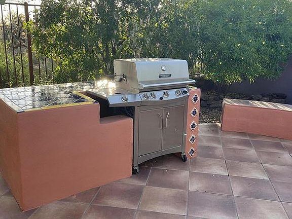 Welcome to this very special home located in the gated community of Peralta Trails. With North/South exposure this cul-de-sac home has 4 bedrooms and 2 updated bathrooms with walk-in showers and handicap accessibility. 24x24 porcelain tile floors throughout entire home. Huge vaulted ceilings, wide hallways and door frames. Kitchen has large walk-in pantry and granite countertops. Back yard is gorgeous with a covered patio and sunshade, built in BBQ, large tile patio, chimenea with seating all around, and a view fence to open desert area with sunset and mountain views. Beautiful desert landscaping in front and back yards. Extended garage with workshop or studio.
