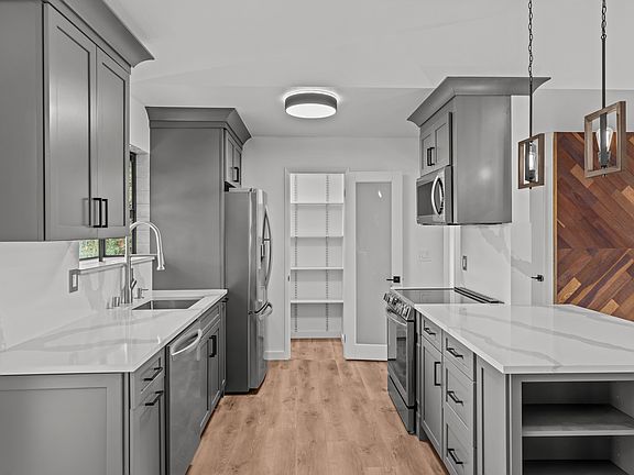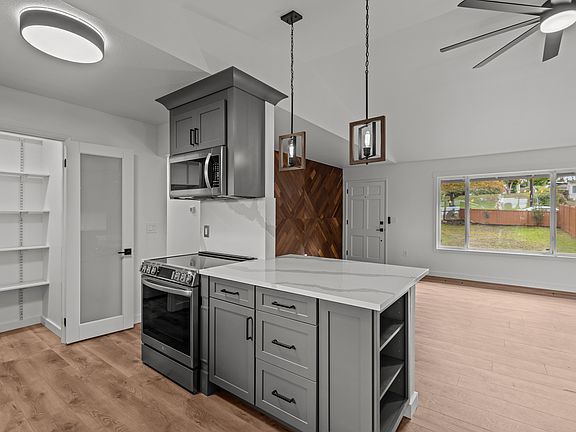 Open concept kitchen and living room with vaulted ceiling provides plentiful amounts of light along with built in shelving and new high end LG appliances.