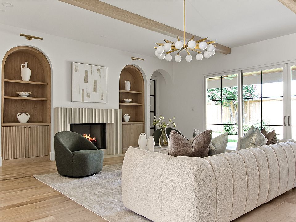 The exterior makes a dramatic first impression with warm brick, natural stone, and expansive windows, while the arched entry sets the tone for the elegance found within. Inside, light-filled open spaces feature soaring ceilings, wide-plank flooring, and a seamless flow ideal for both everyday comfort and hosting at scale.