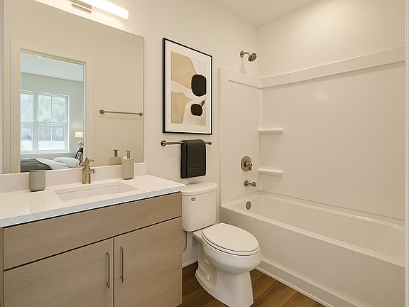 First-floor living features one bedroom, crown molding, 42 soft-close cabinets, luxury vinyl plank flooring, and tile in all baths for a stylish, low-maintenance feel.