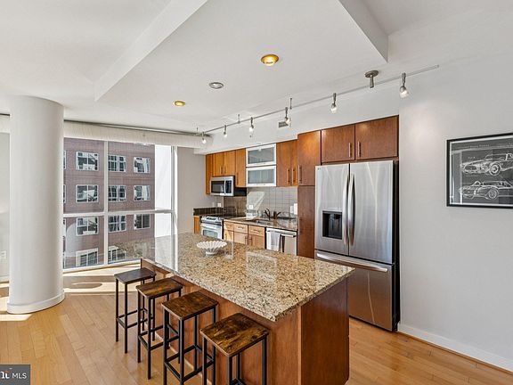 Velocity Condominium | Unit 713 · Two bedrooms · Two full bathrooms · Den · Assigned garage parking on Level P2 conveys · This rarely available corner residence offers one of Velocity’s largest layouts, defined by a continuous wall of windows with far-reaching city views. The open plan connects the living, dining, and kitchen areas for an easy flow of space and light. The kitchen features an island with counter seating, stainless steel appliances, and ample workspace. A separate den provides flexibility for a home office or guest room. The primary suite includes a walk-in closet and an en suite bath with dual sinks, an oversized vanity, and a walk-in shower. Floor-to-ceiling windows fill the room with light, with powered blinds for privacy and light control. The second bedroom also features large windows and a step-in closet. The hall bath includes a full tub and shower combination. Additional details include a full-size in-unit washer and dryer, an entry coat closet, and garage parking on Level P2. Velocity offers a rooftop deck with a heated pool and city views, a community room with catering kitchen, a fitness center with natural light, a children’s playroom, and an on-site dog wash station. 24-hour concierge service and proximity to Metro, dining, and the waterfront complete the offering. Located in the heart of Navy Yard, Velocity provides 24-hour concierge service and easy access to Metro, dining, and waterfront recreation. Beyond the building, the location connects you directly to Navy Yard–Ballpark Metro (Green Line), Nationals Park, and the neighborhood’s vibrant mix of restaurants, breweries, and waterfront attractions. With quick access to The Yards, The Wharf, and Capitol Hill, The Velocity places you at the center of one of DC’s most dynamic and walkable districts.