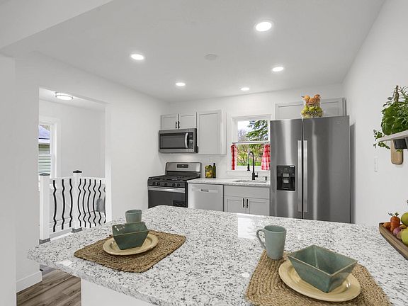 This charming, sun-filled cottage style home has been completely updated. Updates include all new doors and windows, new central AC, newer roof, electric panel and furnace in 2018, maintenance free siding and garage door with opener. The main floor has a new kitchen with granite eat-at counter and new stainless-steel appliances, original hardwood flooring, a full bathroom with tiled surround and floor, and two small bedrooms. The basement has a third bedroom with egress, family room, laundry room, tiled three quarter bath and wet bar with beverage cooler. The large flat yard is great for entertaining with plenty of room for pets and children to play, as well as a 2-car detached garage and shed with room for all your toys.