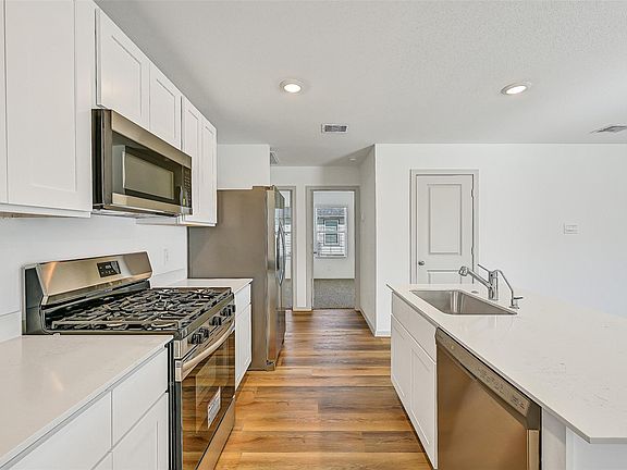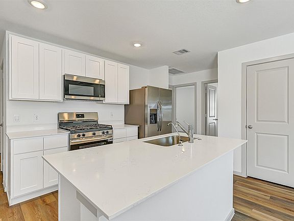 BRAND NEW, super cute, single-story lease home that features 3 bedrooms, 2 bathrooms, and a 2-car garage, located in the brand-new Watermark community in Alvin! The home is light and bright, boasting luxury vinyl plank floors & recessed lighting throughout the main living spaces and an open concept island kitchen complete with quartz counters, a walk-in pantry, and brand new stainless steel appliances. The split floorplan offers one bedroom in the front of the home (perfect for an office or a guest suite!) and the other bedroom and master suite located toward the back of the home. In the master suite, note the oversized shower and generous walk-in closet. Outdoors, enjoy the fenced backyard overlooking a peaceful pond view. This never-lived-in home is MOVE IN READY today!