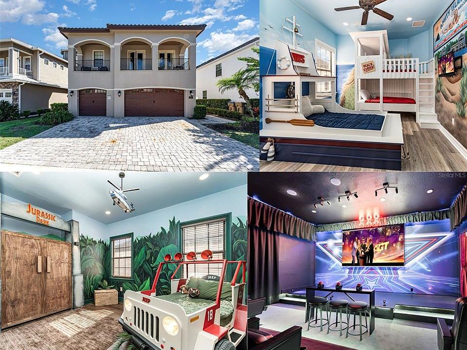 Welcome to The HOLLYWOOD HOUSE!! Located in the beautiful Reunion Resort over looking the 2nd hole of the Jack Nicklaus signature golf course, this home is sure to impress! This FULLY FURNISHED home has been meticulously maintained by its current owners. This home has been completely RENOVATED with HIGH END UPDATES throughout! This home is a must see! Come feel the Old Hollywood glam escape just 15 minutes from Disney. Step through a phone-booth HIDDEN DOOR into a red-carpet AMERICAS GOT TALENT themed hall, then shine in an AGT-style PERFORMANCE THEATER with microphone, karaoke, sound, lights and seating for 15. Enjoy a neon arcade, themed JAWS and JURASSIC PARK CUSTOM THEMED ROOMS, luxe suites, a chic living area, and a private pool and spa overlooking the Jack Nicklaus designed golf course! . REUNION’S Proximity To All The Major Theme Parks Especially Disney World Being Just 2 Exits Away, Makes This Vacation Community A Top Choice For Visitors Of All Ages. If You Are Looking To Take A Few Golf Swings While On Your Vacation You Can Take The Challenge On Any Of The 3 World Class Championship Golf Courses Designed By Arnold Palmer, Tom Watson And Jack Nicklaus That Are Located On Site. Hungry?, Why Not Step Into One Of The 5 Onsite Restaurants That Go From Hamburgers At The Cove To Fine Dining At Eleven And Everything In Between. There Are 12 Pools In The Community Including Multimillion Dollar Water Park With Lazy River & Water Slide.