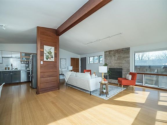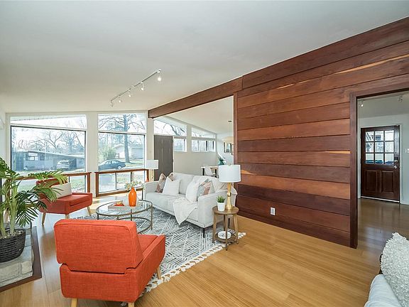 Stunning Ridgewood ranch on a quiet cul-de-sac! One of the largest at 1664 sqft. Designed by St. Louis' beloved mid-century modern architect, Ralph Fournier, this home blends thoughtful updates w/ its original California ranch charm. Gorgeous wood accent walls, clerestory windows, new mod lighting & vaulted ceilings complement the modern, updated kitchen with stainless steel appliances (new DW & fridge), custom flat-front cabinets, quartz counters & an open flow to the dining & living areas. Warm honey-toned bamboo floors run throughout, except for the two updated baths w/ newer tile. The massive en-suite primary bedroom spans the back of the home, offering abundant closet space & private patio access. The level, partially fenced lot w/ newer block retaining wall, backs to trees. 90k BTUs furnace '23, roof '17, gutters & aluminum wrapped fascia '22, AC '17. Fridge, washer/dryer & pantry stay. High-ranked Lindbergh Schools. Renovated w/ MCM style in mind!