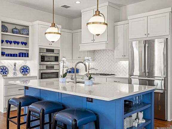 Experience luxury Hill Country living in this stunning rock & stucco home, situated on the golf course in Comanche Trace. Built in 2020 by Jennifer Hyde of Texas Living Homes, this beautifully designed residence blends elegance w/modern comfort. Inside, white oak wood flooring flows throughout, complementing the tall ceilings & abundant natural light streaming through double-pane Andersen windows. The chef's kitchen has quartz countertops, custom cabinetry w/open shelving option, premium stainless Bosch appliances, & ample storage extending into the laundry & baths. The great room is a true showpiece, w/a striking limestone fireplace that can be enjoyed w/gas or wood-burning options. Retreat to the primary suite, where a spa-like bath awaits w/a roll-in/out shower & a luxurious tub. An inviting office showcases built-in shelving highlighted by custom wallpaper, creating a refined workspace. Outside, the back patio has breathtaking views of the driving range & Pinnacle Grill, w/durable tile flooring for easy maintenance. W/an oversized 2.5-car attached garage, exquisite finishes, & thoughtful details throughout, this exceptional home is the perfect blend of style & sophistication.