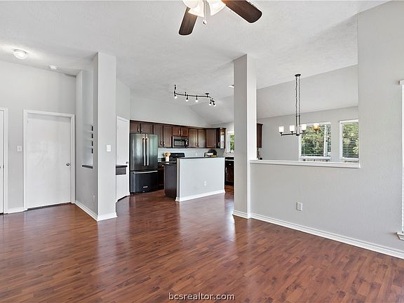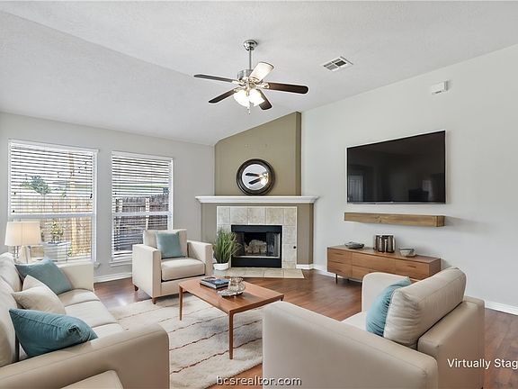 Nestled on an oversized lot for the neighborhood, find this charming 3-bedroom, 2-bath residence which boasts a welcoming floorplan and raised ceilings. The exterior invites relaxation with front and back covered porches and an extended deck off the back patio, providing a serene outlook with no rear neighbors. The home shines with an open-concept floor plan, fostered by a cozy corner fireplace in the living room. Meal preparation becomes a joy in the island kitchen, equipped with granite counters, a modern gas stove, and a corner pantry. The dining space is just off the kitchen and is surrounded by windows with views of the backyard. Each bedroom is equipped with walk-in closets and the split bedroom plan ensures everyone has their own retreat. The primary bedroom takes it a step further with an en-suite bath comprised of double sinks, a garden tub and separate shower, alongside a spacious walk-in closet. Savor the tranquility that this home offers, coupled with the conveniences of a prime College Station location and walkability to local schools and parks. This move-in ready home features several updates, including 2024 microwave, 2022 water heater and 2023 dishwasher. Additionally, the attached 2-car garage offers ample storage and convenience. Don't miss the opportunity to call Fallbrook Loop home!
