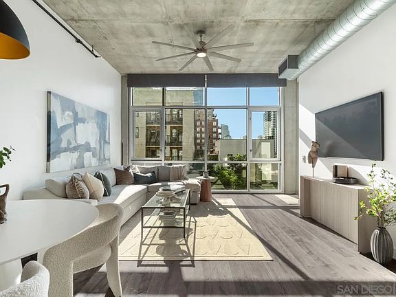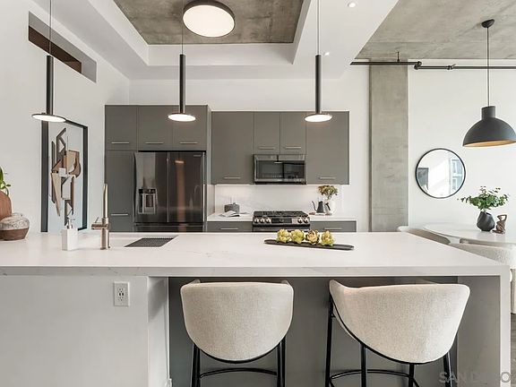 Step into a fully upgraded condominium in the heart of East Village. Designed by a principal of a respected interior design firm, this home has been thoughtfully updated with attention to detail. The open floor plan features recessed LED lighting and durable laminate flooring. At the center of the home, the kitchen is equipped with Euro-style cabinetry, Silestone countertops with a waterfall edge, and under-cabinet lighting for a clean, modern look with upgraded appliances. The bathrooms have been fully renovated with modern, high-end finishes. The primary features a glass tile shower surround with Silestone niche, ceiling rain head, hand shower, and frameless European glass door. New Euro-style vanity cabinets with Silestone countertops. The primary bedroom offers comfort with wall-to-wall carpeting and custom California closets for storage. Smart home features include remote-controlled electric shades, a Nest doorbell with camera, and SwitchBot remote access for the unit door. Building amenities include Amazon delivery lockers and Google Fiber Webpass with 1G internet—all included in the HOA fees. Nestled in the dynamic and walkable East Village neighborhood, this home blends luxury finishes with unbeatable access to San Diego’s top dining, shopping, and entertainment.