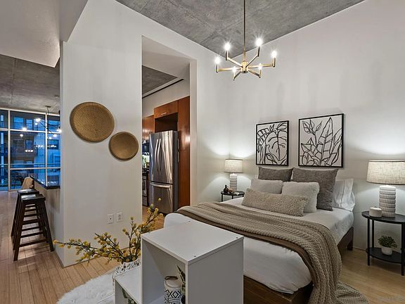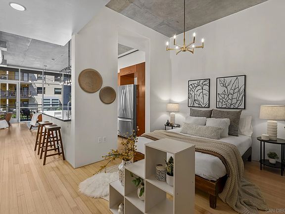 Step into the epitome of downtown living at Fahrenheit, where modern design meets San Diego's vibrant city pulse. This industrial-chic loft spans 726 sq. ft. with soaring concrete walls, sleek finishes, and floor-to-ceiling windows that flood the space with natural light. The open layout provides endless flexibility—whether you prefer a creative studio, stylish one-bed conversion, or entertainer's retreat. From your private balcony, enjoy a unique peek-a-boo view of Petco Park while overlooking the energy of East Village, placing you just steps from world-class dining, craft breweries, and the city's best nightlife. Beyond your front door, Fahrenheit offers residents exclusive amenities, including a secure lobby, underground gated parking, and dedicated secured parking area for bicycles. High-speed fiber internet is included with HOA services, ensuring seamless connectivity for work or play. Whether you're a sports fan walking to the game, a professional craving a lock-and-leave lifestyle, or a first-time buyer looking to own a piece of the city, this home delivers the perfect balance of style, convenience, and location. Live where the action is—Unit 407 invites you to experience East Village at its finest.
