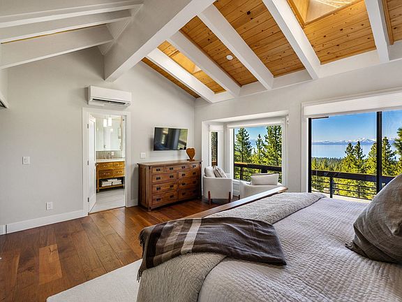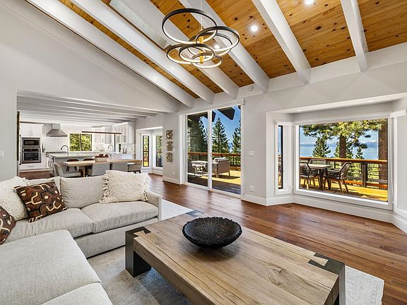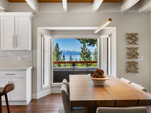 Welcome to the Lake Vista Lodge — a magical 4-bedroom, 5-bath sanctuary nestled at the end of a peaceful cul-de-sac, backing to US Forest Service land. Spanning three levels, with over 3,400 square feet of living space, this fully remodeled 2023 mountain contemporary design is tastefully curated, offering elegant living spaces, masterfully executed finishes, superior craftsmanship, and panoramic lake and mountain views from most rooms. This home offers superior climate control with a 3-zone heating system and central air conditioning. The new designer kitchen is extraordinary as it is light and bright, and offers stunning lake views. The chef’s kitchen is built around professional-quality appliances, including a Viking 6-burner range, a 48-inch Jenn-Air built-in refrigerator, a porcelain farmhouse sink, quartz countertops, shaker cabinetry, a handmade subway tile backsplash, and a massive center island with a secondary sink. There is even a large pass-through window to the expansive front deck, perfect for entertaining. The kitchen opens to a warm and inviting living room featuring vaulted ceilings, a striking floor-to-ceiling fireplace with contemporary layered stone surround, a remote-controlled gas insert, and expansive lake view windows that flood the space with natural light. The living room offers a 96” sliding door providing access to two expansive decks with panoramic lake views and all-day sun. There is a motorized retractable awning over the outdoor living area for flexible comfort. The turret deck offers a gas fireplace with lake views—perfect for gatherings under the stars. The private spa has a fully automated Covana cover, stunning lake views, and is the ideal spot to unwind after a day filled with adventure. All 4 bedrooms feature en-suite bathrooms, and there is a 5th bathroom located off the lower-level family room. All bathrooms have been tastefully remodeled, featuring custom cabinetry, stone countertops, high-end bath fixtures, and custom showers with glass enclosures. The primary bathroom is spa-like, offering vaulted ceilings, lake views, a gorgeous custom shower, and a stunning walnut vanity. On the lower level of the house, there is an exceptional family/media room with a bar area, a gas stove, and stunning views of Lake Tahoe. Your guests will unwind, watch movies, and create lasting memories in this room. The lower level also features a full bathroom, mechanical room, storage, and garage access. All 4 bedrooms are exceptional and feature hardwood flooring, vaulted ceilings, and en-suite bathrooms, creating a warm and cozy retreat for you and your guests. The primary bedroom and one guest suite offer exceptional views of the lake. The expansive .68-acre lot backs to National Forest land, creating a private and serene setting to enjoy your time at Lake Tahoe. Hiking and mountain biking trails located out the back door connect to the Tahoe Rim Trail and Martis Peak, and in the winter months, you can snowmobile and backcountry ski from the house. A large portion of the backyard is fenced, which is perfect for pets, children, and helps keep wildlife at bay. There is an oversized lakeview storage shed that could be used as an artist studio or potentially converted into an ADU. The oversized garage can possibly accomodate 4 cars and there is a large storage room in the garage. Furnishings are negotialble, creating a turn-key opportunity.