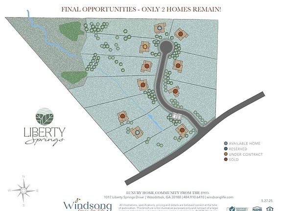 Lot 4 Windsong’s Wesleyan plan - PRICE IMPROVEMENT ON FINAL OPPORTUNITY - MOVE IN READY Custom home with basement and 2 car garage nestled on a fairytale 1.38 acre homesite nestled in the woods - You'll love living in Liberty Springs, a Woodstock community of only 10 homes on 1 + acre homesites. Liberty Springs is conveniently located close to Hickory Flat, Crabapple and Woodstock and is a community by Obie and Guildmaster award-winning builder Windsong Properties! This home is unique as it is set atop a hill like a gem providing beautiful views of the North Georgia Mountains. This example of the Wesleyan floor plan boasts a full unfinished basement, 5 total bedrooms with 4 total full baths. It’s a MUST SEE! Enjoy wooded backyard and huge side yard from your covered back porch as well as from your generous kitchen and family room. This home offers wide-open living spaces to enjoy time with family and friends. Along with the soaring 10’ ceilings on the main level and 9’ on 2nd level, this home is decked out with high-end options you won't find anywhere else. Enjoy the open feel as you enter and cozy up to the modern gas log fireplace in the Great Room that opens to the gourmet kitchen. Kitchen boasts quartz countertops, tile backsplash with 42” Shrock Entra cabinets with soft-close doors and drawers with a contrasting island along with Kitchen Aid stainless appliances with a large vent hood, gas cooktop and built microwave and oven. A Guest suite/office and a full bathroom are also located on the main level. The Guest Suite bath has a large tiled standing shower and frameless shower door. The second floor has 4 spacious bedrooms, 3 en-suite baths and a large laundry room with laundry sink with access from owners’ closet and hallway that makes laundry a breeze! A luxurious Owners Suite provides space for a sitting area and a beautiful spa bath with a large, tiled shower with frameless shower door, separate vanities and a stunning stand-alone tub. The 3 additional spacious bedrooms have generous-sized closets so there is a place for everything. This home is staged to highlight its livability. Sod with sprinkler system and termite bait system in yard.