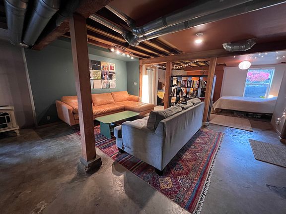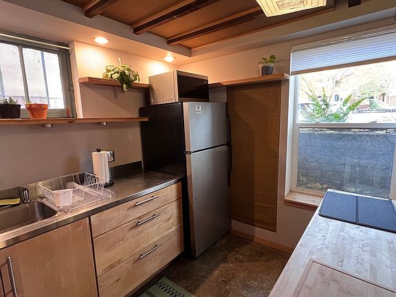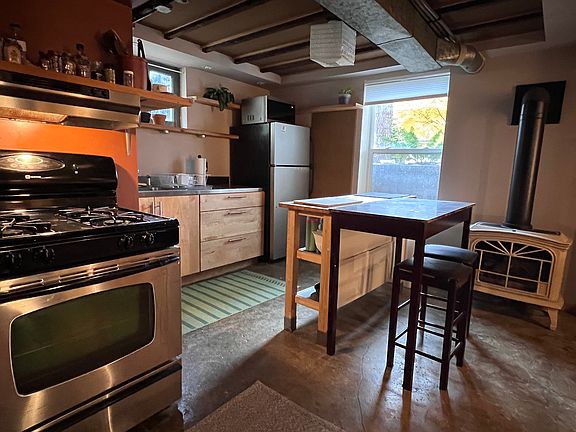 This basement studio is great space with a lot of character. With windows on three sides, open layout, exposed wood beams and concrete floor it has a modern and cozy charm. The free standing gas stove keeps the space warm and inviting. The studio has it's own entrance, and a shared laundry room as part of a three-unit property. Off street parking and garage space also available. Utilities will be $50/month. Open to 6 month or 1 year lease term. Use of detached garage available for extra $50/month. Could offer furnished for added fee, please inquire if interested.