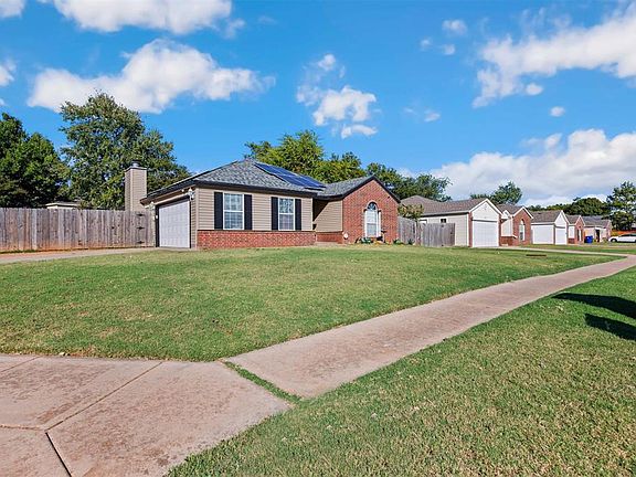 Charming corner lot with modern upgrades! FREE SOLAR PANELS!!! Get ready for really low electric bills. Welcome to your dream home! This beautifully updated 3 bed, 2 bath gem is perfectly situated on a spacious corner lot, offering both privacy and convenience. Step inside and be greeted by a large living area with a cozy fireplace, perfect for relaxing evenings with family and friends. The primary bedroom features a luxurious en suite bath with double vanities, jetted tub and ample space to unwind. This all electric home boasts solar panels that will remain with the property at no additional cost to buyer, ensuring incredibly low monthly utility costs. Recent upgrades include a brand new roof, new HVAC, sleek new flooring, and energy efficient windows that fill the space with natural light. For added peace of mind, a storm shelter is also included. With ample storage throughout and a separate laundry room, every detail of this homes has been thoughtfully updated. It is truly move in ready! Don't miss your chance to see this stunning home in person. Schedule your showing and start imagining the possibilities! Solar Panels will remain with home at no xtra charge to buyer! Get ready to save on your utilites!!!