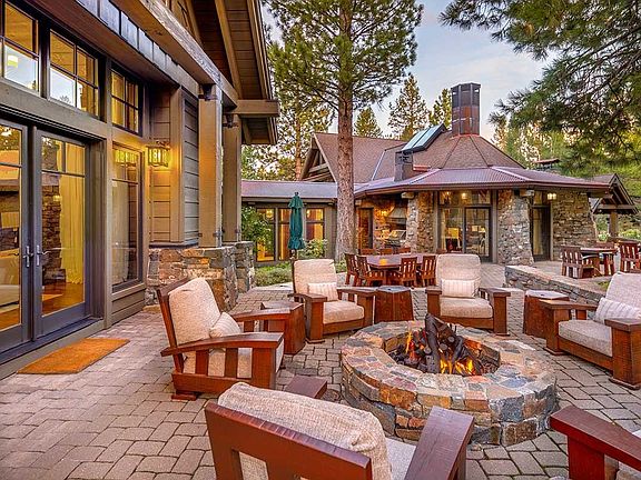 All features of this two-lot estate – its size, location and quality of craftsmanship – collaborate for an elegance normally reserved for the great lodges of America. At 8,946 square feet, this estate features 7 bedrooms, 7 full baths, and 3 half baths, spans two lots, and offers a stunning 180º view of the 18th fairway of the Tom Weiskopf–designed Lahontan Golf Course. That scene of forest fairway and sunset is front and center from an undulating veranda that stretches the length on the back of the home. With its various tables, firepit and intimate coves, the patio is nothing short of a dream setting for entertaining friends and family. From here, it’s a short stroll across the fairway to The Lahontan Lodge for a workout, spa session, or an evening of fine dining. The allure of this home, however, makes it hard to walk away from. Upon entering, you’re faced with halls leading left and right and a peek at the backyard setting before you. Left leads to a stunning semi-circle bar and a gathering spot unlike any other. At the base of a towering metal flue is a fireplace encircled by seats and doorways sliding open to the back patio. The room’s ambience is reminiscent of a mountain chateau where cocktails and the comfort of a fire stokes the kinds of conversation and camaraderie that will long be treasured. Above and behind the bar, a custom metal staircase leads to a media room with two decks and billiard table and, a few steps up, a bedroom with two double beds. Beyond the downstairs bar is a hallway leading to the primary suite with impressive rock fireplace, bold beams, two patios, and an opulent copper bath. Another wing right of the entry leads to the hub of this amazing home – a great room with a big rock fireplace, massive beams, suspended canoe, and access to the fairway-fronting patio. There’s a huge central island for breakfasts and late-night gatherings, a dining room with 180º windows, game/breakfast nook, and a kitchen with pantry, impressive stove with iron hood, and a large working counter. A few steps away is an intimate study that can double as a media room. The hallway further meanders toward a gym and a second primary suite with fireplace and patio access, while a staircase leads to a landing where one direction leads to two bedrooms and a sauna while the other course brings you to a bunk room that sleeps eight. As detailed and spectacular as the home may be, it’s likewise imbued with a sense of comfort and familiarity, features that make everything from mornings at the breakfast nook to backyard barbecues ideal settings for creating fond memories and lasting legacies. Finally, at all points of this home’s exterior is a landscape plan that was masterfully planned and executed and that seems to forever enchant.